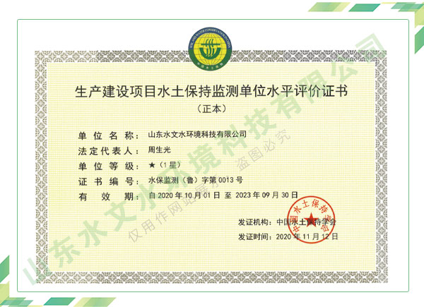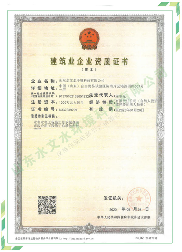 公司擁有水利工程設計、水土保持、水文水資源調查評價、水資源論證、建設項目環境影響評價、市政公用工程施工總承包、水利水電工程施工總承包、電子與智能化工程專業承包等資質,2017年通過質量管理體系、環境管理體系、職業健康安全管理體系認證;2020年被評為國家級高新技術企業,同年被中國水利企業協會推薦為第一批“合同節水服務企業”;2021年被山東省、濟南市評為 “專精特新”中小企業。業務范圍涉及水利工程設計;節水設計、改造、水平衡測試;山洪災害調查;城市水資源調查評價;建設項目水土保持方案編制、監測、驗收、水土保持規劃;水安全保障規劃、建設項目水資源論證、規劃水資源論證;建設項目環境影響評價;入河排污口論證;防洪影響評價;市政公用工程施工、水利水電工程施工、電子與智能化工程施工等。
